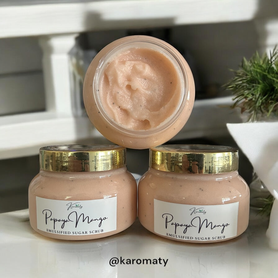 Papaya Mango Body Scrub is an emulsified sugar scrub. It gently removes dead skin cells and leaves skin soft and moisturized. Get radiant skin with this nourishing exfoliation.