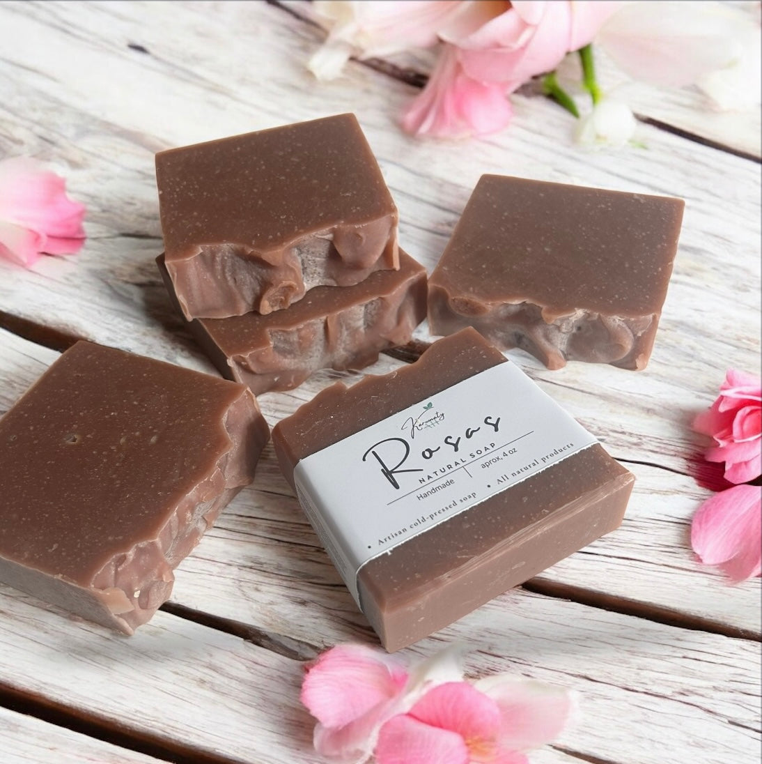Este jabón de rosas contiene pétalos en polvo y hidrolato, haciéndolo natural y beneficioso para la piel. El aroma de rosas proporciona un efecto relajante y el uso regular puede mejorar la salud de la piel.